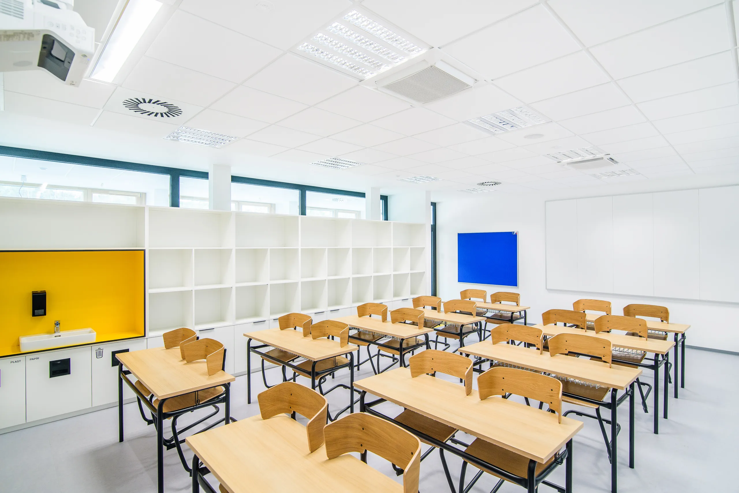 In shared spaces like the atrium and canteen, Rockfon Sonar X with a concealed grid system offers optimal acoustic control. In classrooms, Sonar M delivers similar sound performance in a modular layout.