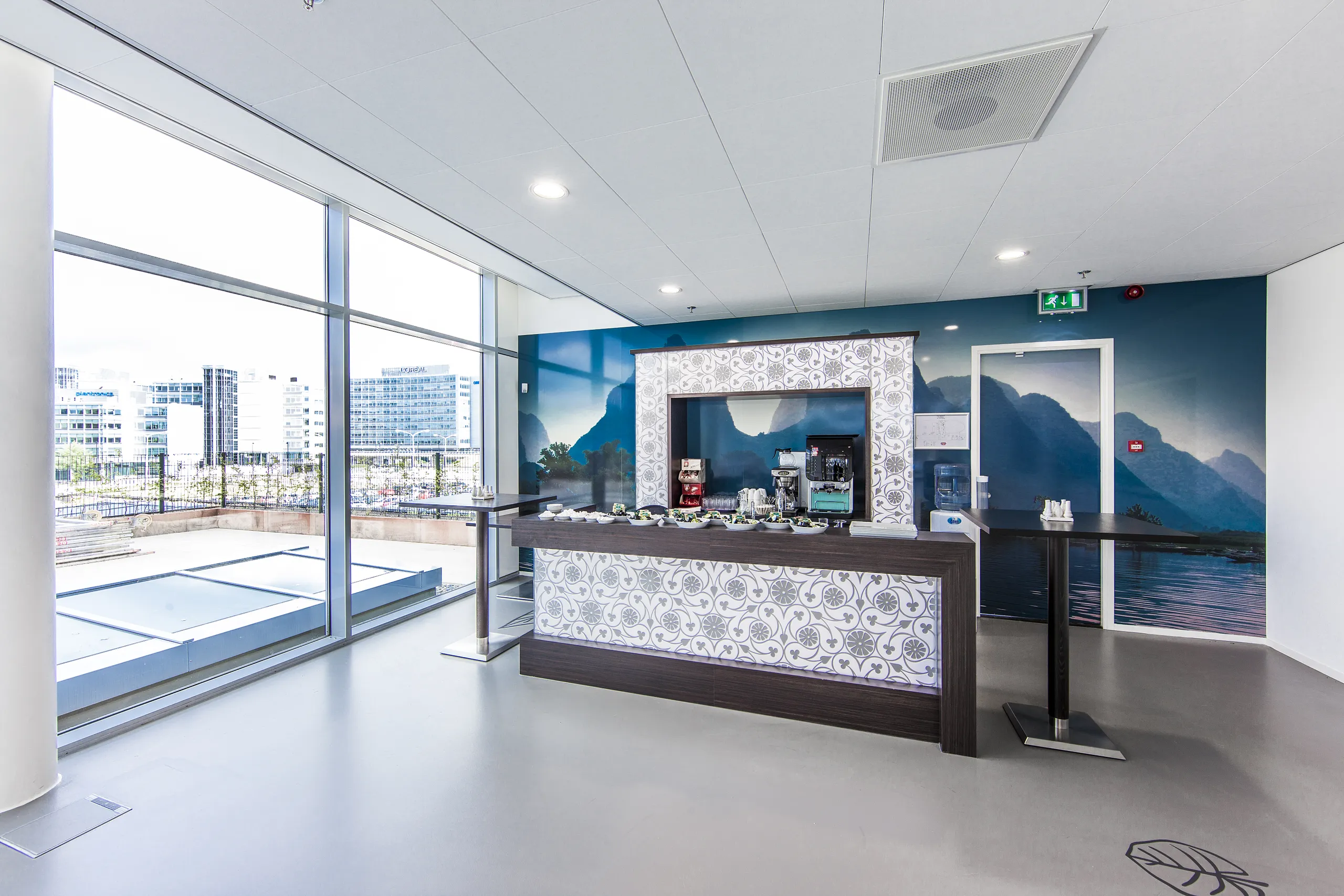 Integrated lighting and Rockfon ceilings ensure consistent design