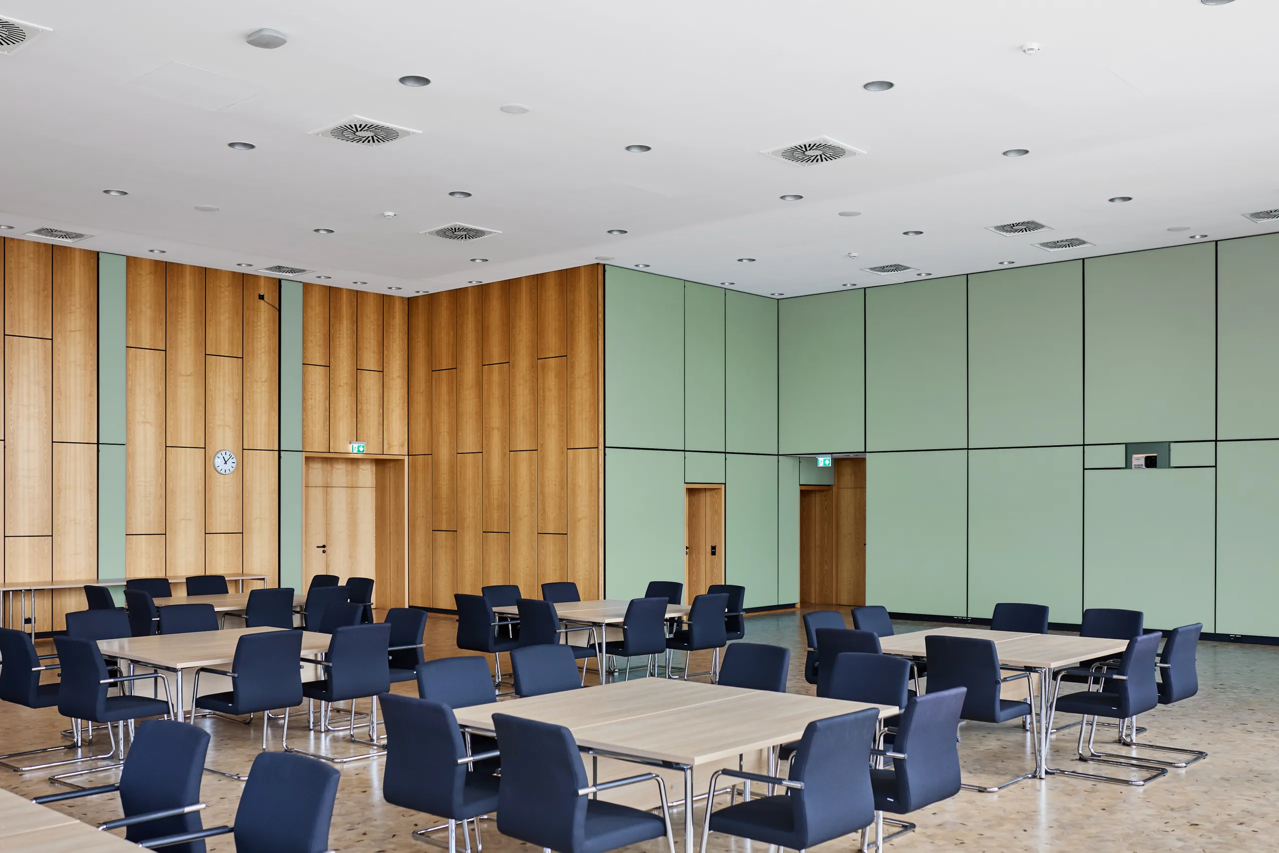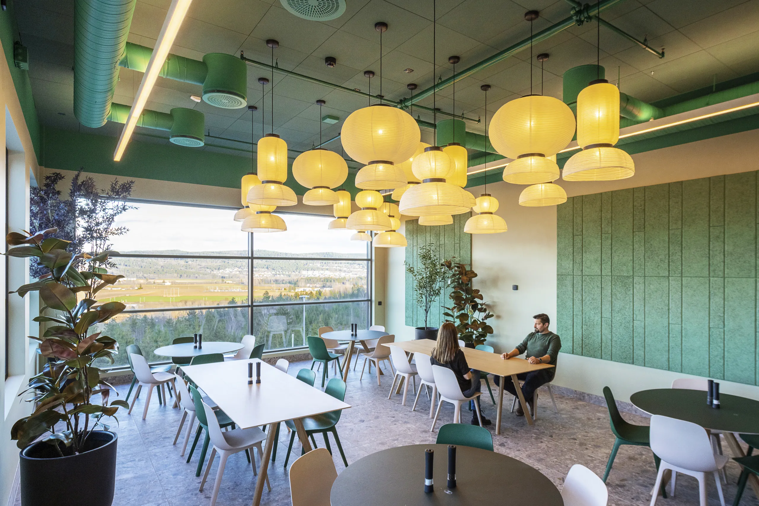 Rockfon Color-all acoustic ceiling tiles installed in the Seaweed colour at a dining area.