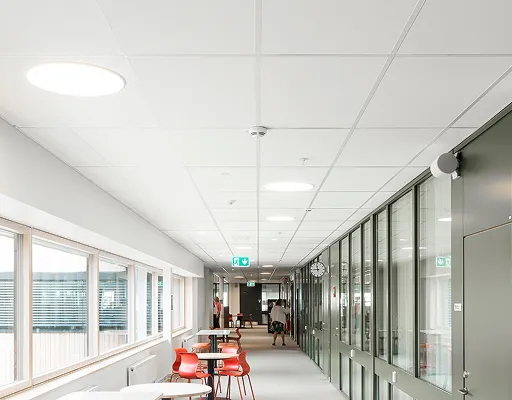 The ultra-matte, anti-static surface of Rockfon Eclipse white floating ceiling panels reflects 87% of lighting, maximising brightness and supporting energy efficiency.