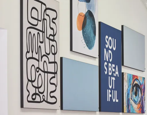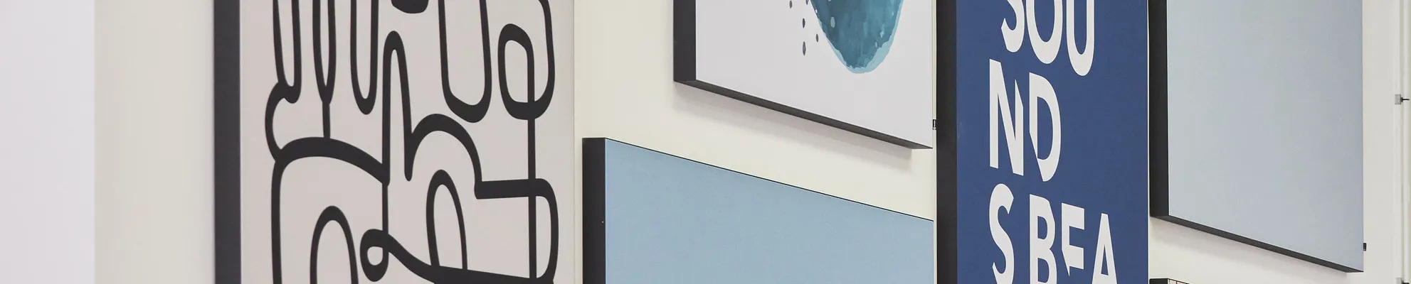 Whether wooden slats or matte aluminium frames or custom-print textile canvases, choose the surfaces and finishes that feel right for your material and colour palette.