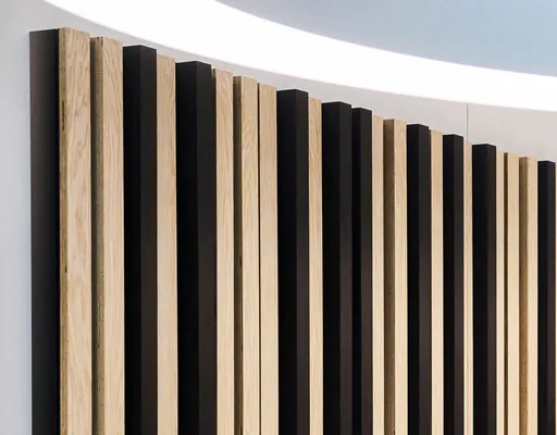Discover Rockfon Lamella, the modular acoustic wall system with oak-veneered slats and stone wool sound-absorbing panels configurable in over 650 000 ways.
